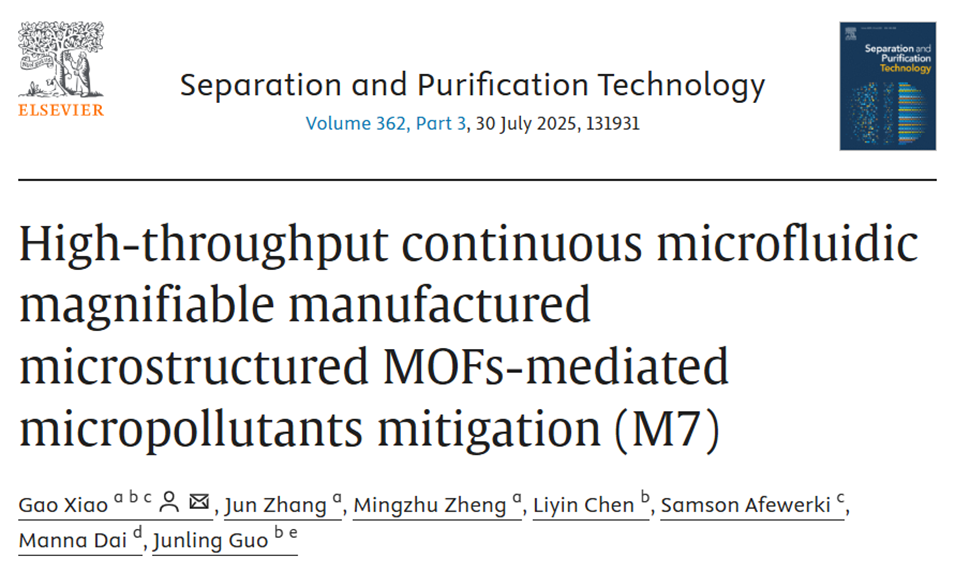 近期,福州大学环境与安全工程学院肖高副教授团队开发了一种高通量、连续的微流控合成新策略,成功制备出具有均匀微观结构的MF-UIO-66材料,并将其用于高效去除水体中的有机砷污染物。该材料在吸附容量、循环稳定性和合成效率方面均显著优于传统水热法制备的样品,为金属有机框架材料的规模化制备与水污染控制提供了新路径。相关研究以“High-throughput continuous microfluidic magnifiable manufactured microstructured MOFs-mediated micropollutants mitigation (M7)”为题,发表于期刊《Separation and Purification Technology》。