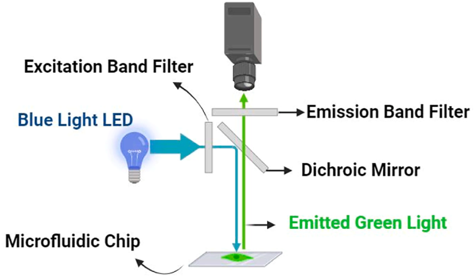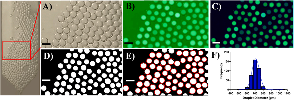 3、通过数值模拟优化液滴生成与混合性能,并采用低成本相机、二向色镜和LED搭建荧光检测系统,结合Python图像处理分析液滴荧光强度与尺寸分布。