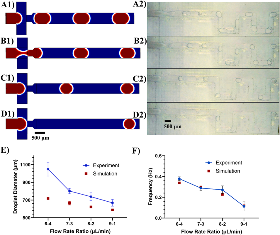 图6. 不同流速比下液滴生成的实验与数值研究:A)6-4、B)7-3、C)8-2、D)9-1(注:流速比中数值分别代表连续相和分散相流速,单位为微升/分钟);E)液滴直径随流速比的变化;F)液滴生成频率随流速比的变化