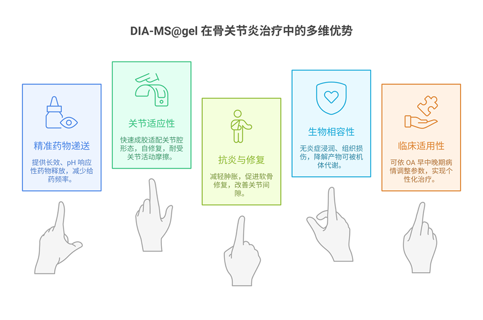 1、本研究开发了一种新型可注射动态交联水凝胶复合递送系统DIA-MS@gel,用于骨关节炎(OA)治疗。