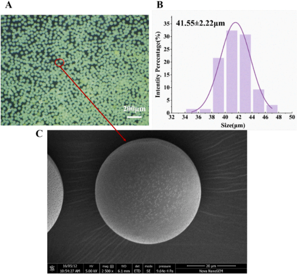 图2:A. DIA-MS的显微形貌;B. DIA-MS的粒径分析;C. DIA-MS的扫描电镜图