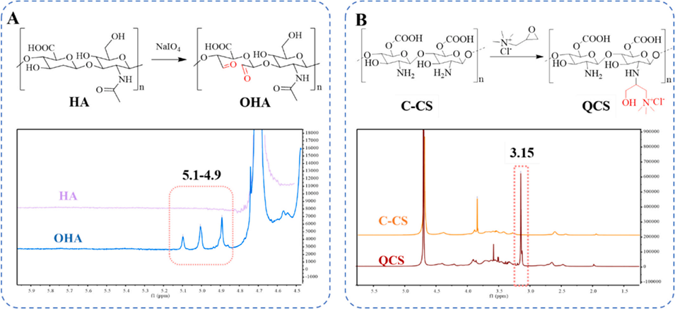 图4:氧化透明质酸(OHA)(A)与季铵化壳聚糖(QCS)(B)的核磁共振氢谱图