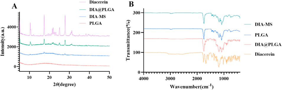 图3:A. X射线衍射分析结果;B. 傅里叶变换红外光谱分析结果