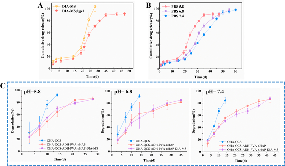 图8:A. DIA-MS@gel与DIA-MS在pH5.8条件下的体外释放曲线;B. DIA-MS@gel在pH5.0、pH6.0和pH7.4条件下的体外释放曲线;C. 水凝胶在pH5.0、pH6.0和pH7.4条件下的体外降解曲线