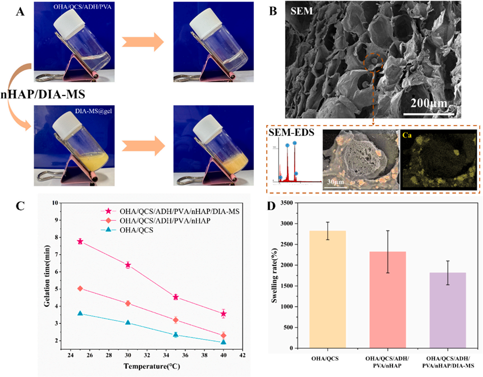 图6:A. 凝胶(OHA/QCS/ADH/PVA)与DIA-MS@gel的凝胶化过程;B. DIA-MS@gel的扫描电镜图与扫描电镜-能谱图;C. 水凝胶的凝胶化时间;D. 水凝胶在磷酸盐缓冲液中的溶胀率