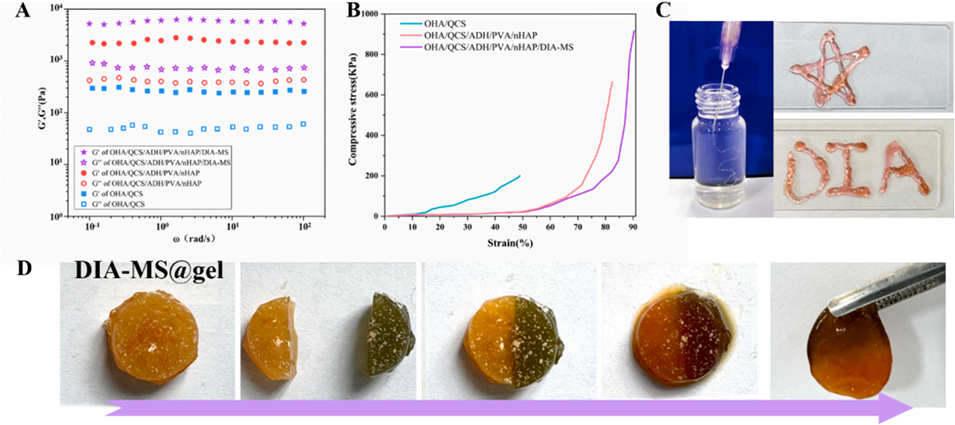 图7:A. 水凝胶在不同频率下的储能模量(G′)与损耗模量(G″);B. 水凝胶的压缩应力-应变曲线;C. DIA-MS@gel的可注射性;D. DIA-MS@gel的自修复性能表征