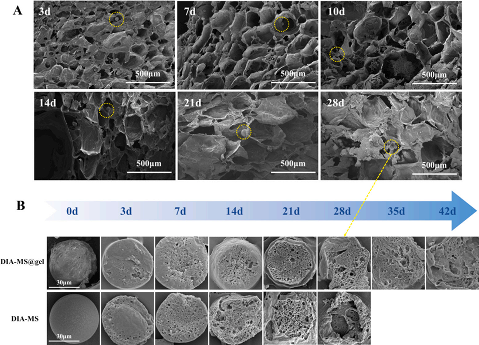 图9:A. DIA-MS@gel在pH5.8条件下的体外降解扫描电镜图;B. DIA-MS在pH5.8条件下的体外降解扫描电镜图