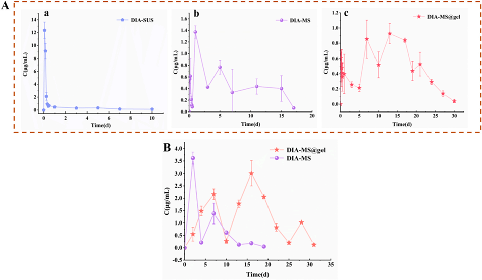 图10:体内药代动力学曲线(A. 血浆浓度-时间曲线:a. 双醋瑞因悬浮液(DIA-SUS)、b. DIA-MS、c. DIA-MS@gel;B. 滑液浓度-时间曲线)