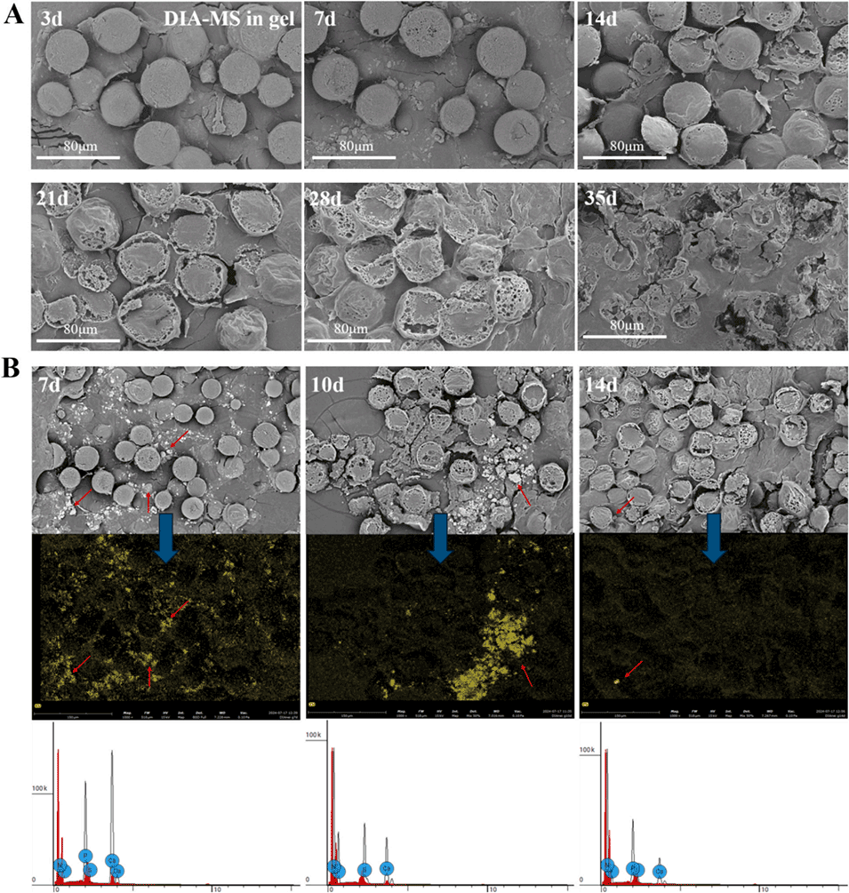 图11:A. DIA-MS@gel的体内降解情况;B. 纳米羟基磷灰石(nHAP)的体内降解情况(扫描电镜-能谱图)
