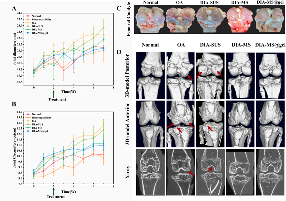 4、兔体内研究显示,关节腔注射DIA-MS@gel可实现超过31天的持续药物释放,有效减少给药频率、减轻炎症并促进骨组织再生,且具有良好生物相容性,为OA临床治疗提供了潜在实用方案。