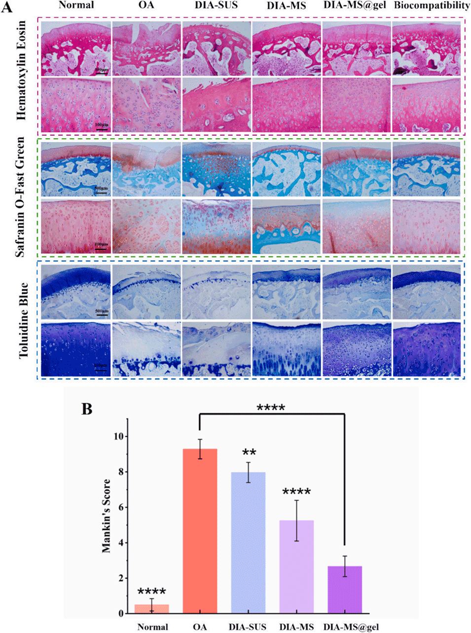 图13:A. 关节软骨病理切片的显微图;B. 各组膝关节的Mankin评分(**表示P<0.01;****表示P<0.0001)