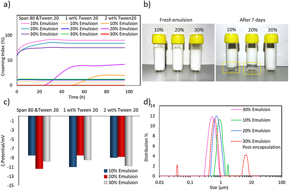 图1.(a)采用吐温20与司盘80的混合物、1wt.%吐温20及2wt.%吐温20作为表面活性剂时,含10%、20%和30%油相的乳液的分层指数。(b)含2wt.%吐温20的新鲜乳液及相同乳液在7天后的图像。(c)10%、20%和30%油相乳液的ζ电位值。(d)含2wt.%吐温20的10%、20%和30%油相新鲜乳液的液滴尺寸,以及封装后30%油相乳液的液滴尺寸。