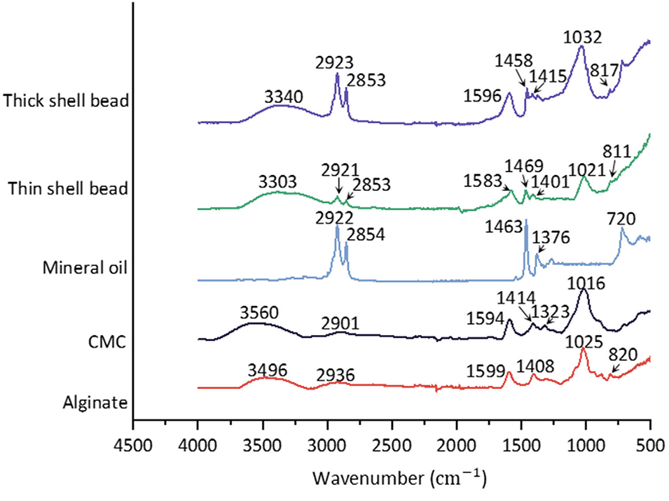 图3. 海藻酸钠、羧甲基纤维素(CMC)、矿物油,以及直径为3.5mm、壳厚度分别为0.058mm(薄壳)和0.36mm(厚壳)的乳液核-海藻酸钠微球的FTIR图。