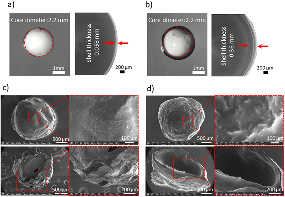 图2.(a)核直径为2.2mm、壳厚度为0.058mm的微球的光学图像及侧视显微图像;(b)核直径为2.2mm、壳厚度为0.36mm的微球的光学图像及侧视显微图像。(c)薄海藻酸钠壳层核壳微球的SEM图像(含对应横截面视图);(d)厚海藻酸钠壳层核壳微球的SEM图像(含对应横截面视图)。
