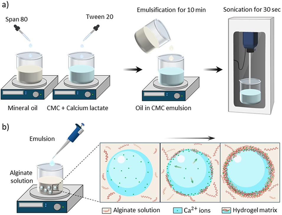 图5. 乳化过程及微球形成的示意图:(a)在羧甲基纤维素与乳酸钙水溶液中制备矿物油乳液的过程。初始阶段,将表面活性剂分别与羧甲基纤维素-乳酸钙混合物、矿物油充分混合5分钟;随后,将这两种混合物在搅拌器上以1500rpm的转速搅拌10分钟进行乳化;之后,对所得乳液进行30秒超声处理。(b)当乳液液滴加入海藻酸钠溶液后,钙离子从乳液中迁移至液滴表面,并与海藻酸链配位结合,形成类似“鸡蛋嵌入蛋盒”的网络结构。