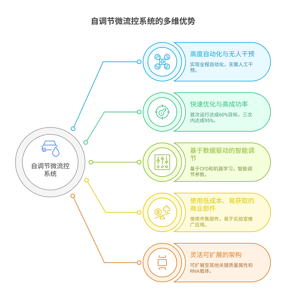 1、本研究提出了一种结合计算流体动力学模拟与机器学习的自调节微流控系统,用于自动化优化脂质纳米颗粒(LNP)的制备。