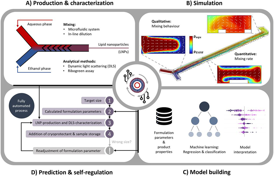图1. 结合模拟与机器学习的自动化LNP制备与表征流程概览