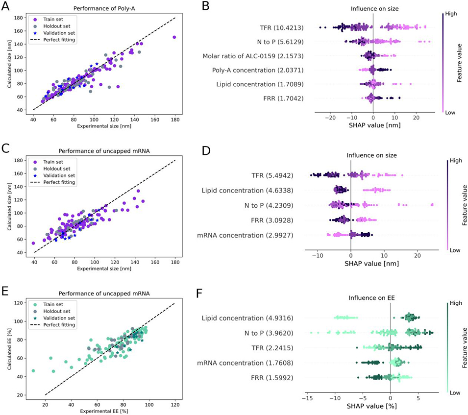 使用随机森林模型预测LNP的尺寸和包封率,并通过SHAP分析揭示各参数(如TFR、N/P比、PEG含量)对关键质量属性的影响。
