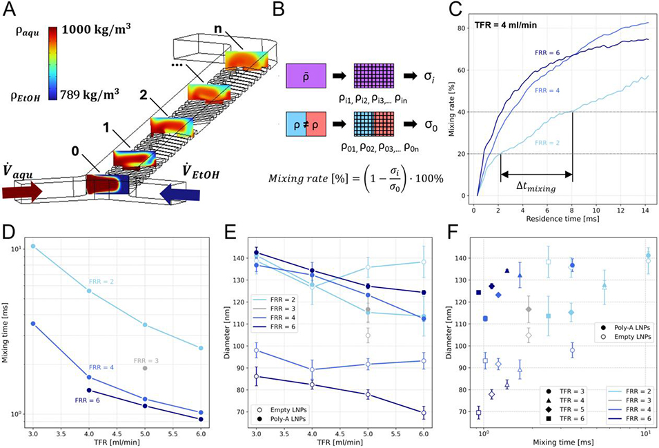 通过CFD模拟揭示了微流控混合器中流体混合的动态过程,特别是混合时间对LNP尺寸的影响。
