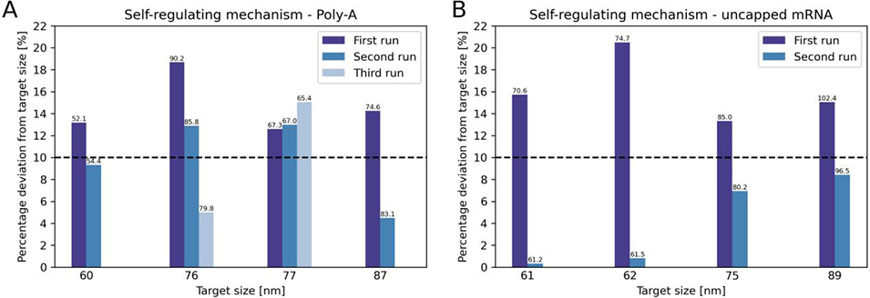 5、将仿真与机器学习结果整合到微流控系统,以目标粒径为输入,系统自动预测初始配方参数,若制备的LNPs粒径偏离目标,最多3次循环即可使95%的LNPs达到目标粒径范围,无需人工干预。