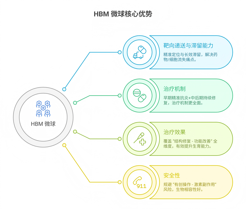 现有治疗方案存在显著局限:单纯激素治疗易引发内分泌紊乱等副作用,且对中重度损伤修复效果微弱;干细胞移植虽展现出再生潜力,但缺乏有效载体导致细胞易随宫腔液流失,难以在靶区长效发挥作用;常规支架材料虽能固定细胞,却多无法实现 "抗炎 - 修复" 的时序协同调控。