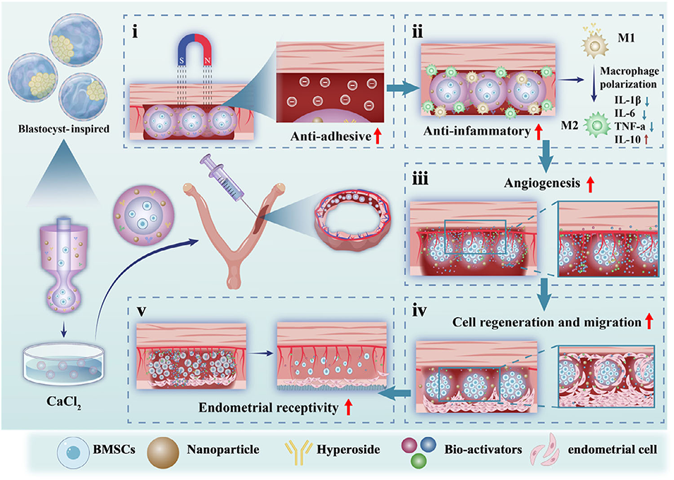 1、针对子宫内膜损伤及宫腔粘连(IUA)的治疗难题,本研究受囊胚结构启发,开发了一种核壳微球(HBM),用于递送骨髓间充质干细胞(BMSCs)和金丝桃苷(HYP)。