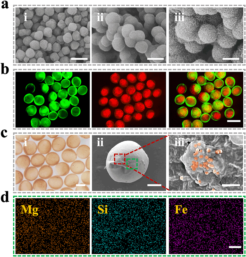 2、该微球采用微流控电喷雾技术制备,外壳为海藻酸钠包裹Fe3O4@MgSiO3磁性纳米颗粒,内核为羧甲基纤维素包封的BMSCs,可实现时序释放。