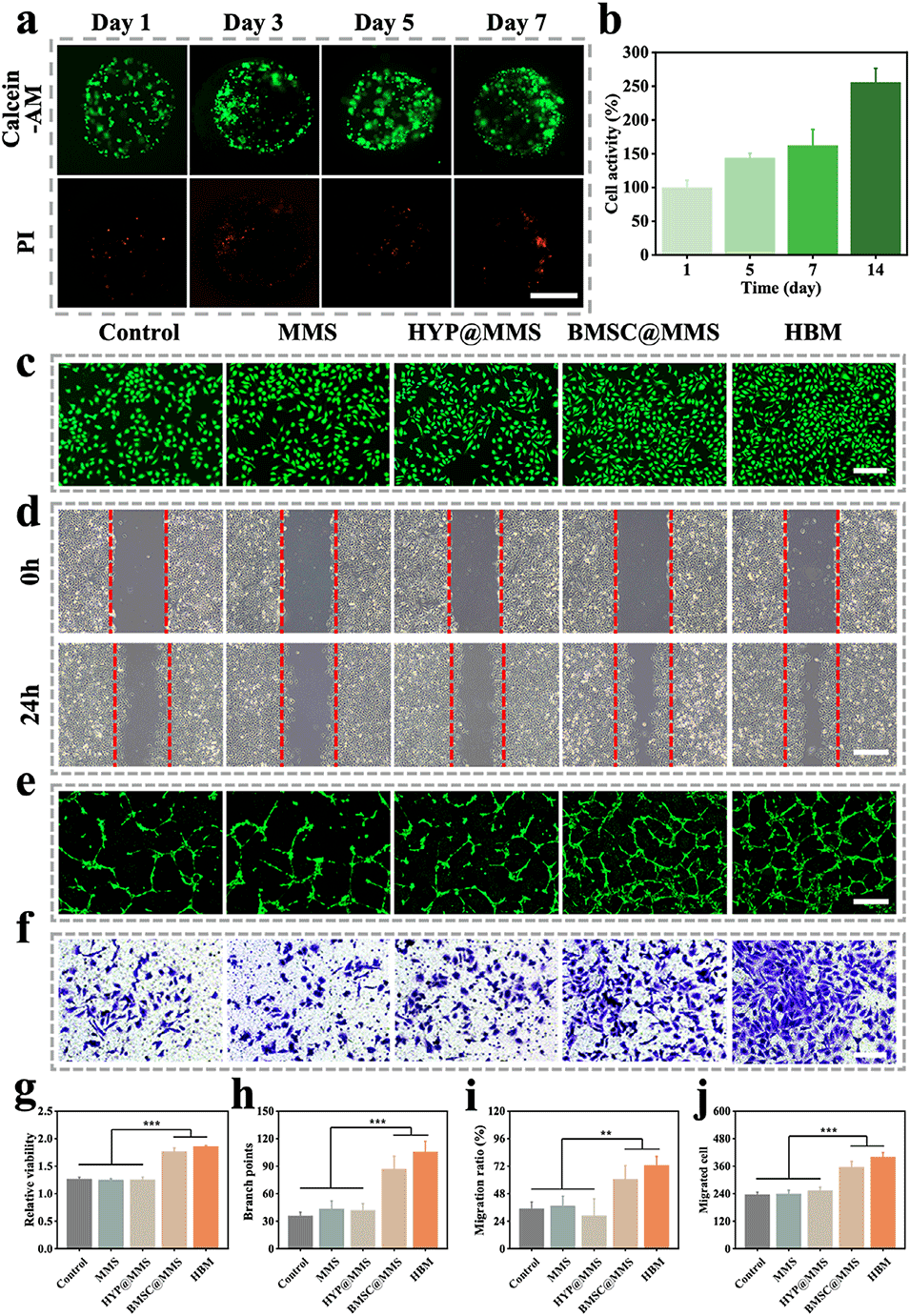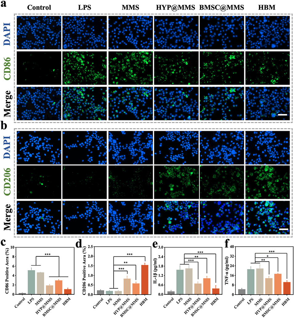 3、壳层HYP通过促使巨噬细胞向M2表型极化以调控早期炎症;内核BMSCs通过旁分泌促进血管生成与组织修复。体外实验表明HBM可促进内皮细胞增殖、成血管并抑制炎症。