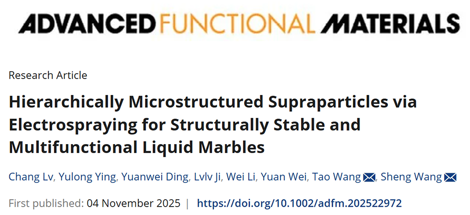 近期,浙江理工大学王晟教授、王騊教授团队利用绿色高效的电喷雾技术,成功制备出具有分级微结构的超粒子,并以此构建了结构稳定、功能多样的液体弹珠。该研究不仅系统阐明了超粒子结构与性能间的构效关系,还展示了液体弹珠在微反应、液体操控乃至集成式水分解系统中的应用潜力。相关研究以“Hierarchically Microstructured Supraparticles via Electrospraying for Structurally Stable and Multifunctional Liquid Marbles”为题,发表于期刊《Advanced Functional Materials》。