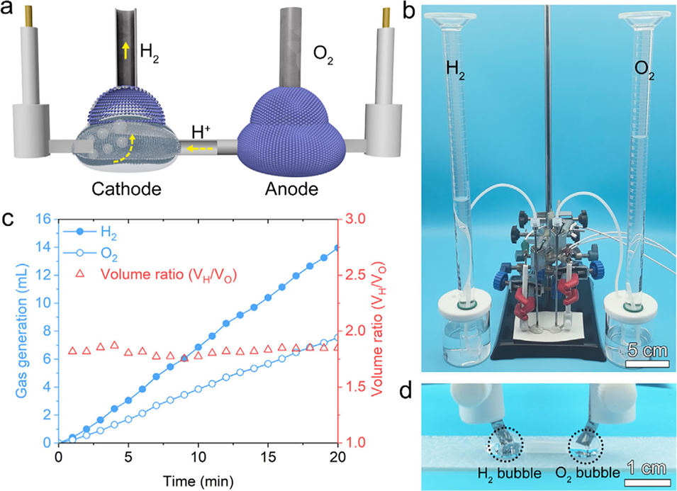 5、基于此,进一步构建了基于液体弹珠的集成水分解系统,实现了连续的氢气与氧气生成、传输及化学计量收集。本研究为设计用于封装、自适应微流体和微尺度电化学应用的下一代LM平台提供了新思路。