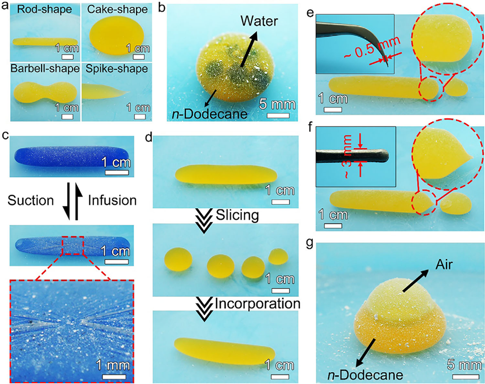 4、此外,该液体弹珠展现出多种功能,如可控非球形形貌、多液滴封装、吸/注液诱导形变、切割-重组行为以及稳定气-液双相异质结构的形成。