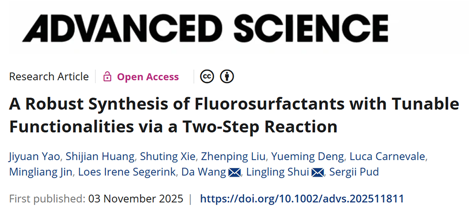 近期,华南师范大学水玲玲教授、王达教授团队开发了一种在温和条件下仅需两步即可高效合成功能可调含氟表面活性剂的新方法。利用该方法制备的表面活性剂不仅能显著提升微滴的稳定性和生物相容性,更展现出选择性富集荧光分子与指导纳米粒子自组装成不同超结构的独特功能。相关研究以“A Robust Synthesis of Fluorosurfactants with Tunable Functionalities via a Two‐Step Reaction”为题目,发表在期刊《Advanced Science》上。