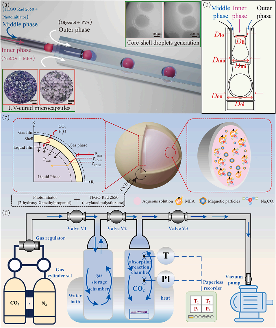 图1. 实验装置示意图。(a)同轴流动微流控装置示意图,右上角插图展示核壳液滴生成过程,左下角小图展示光聚合后得到的紫外固化微胶囊;(b)三相流体流动示意图;(c)吸收过程与壳层固化示意图;(d)CO₂吸收测试装置示意图。