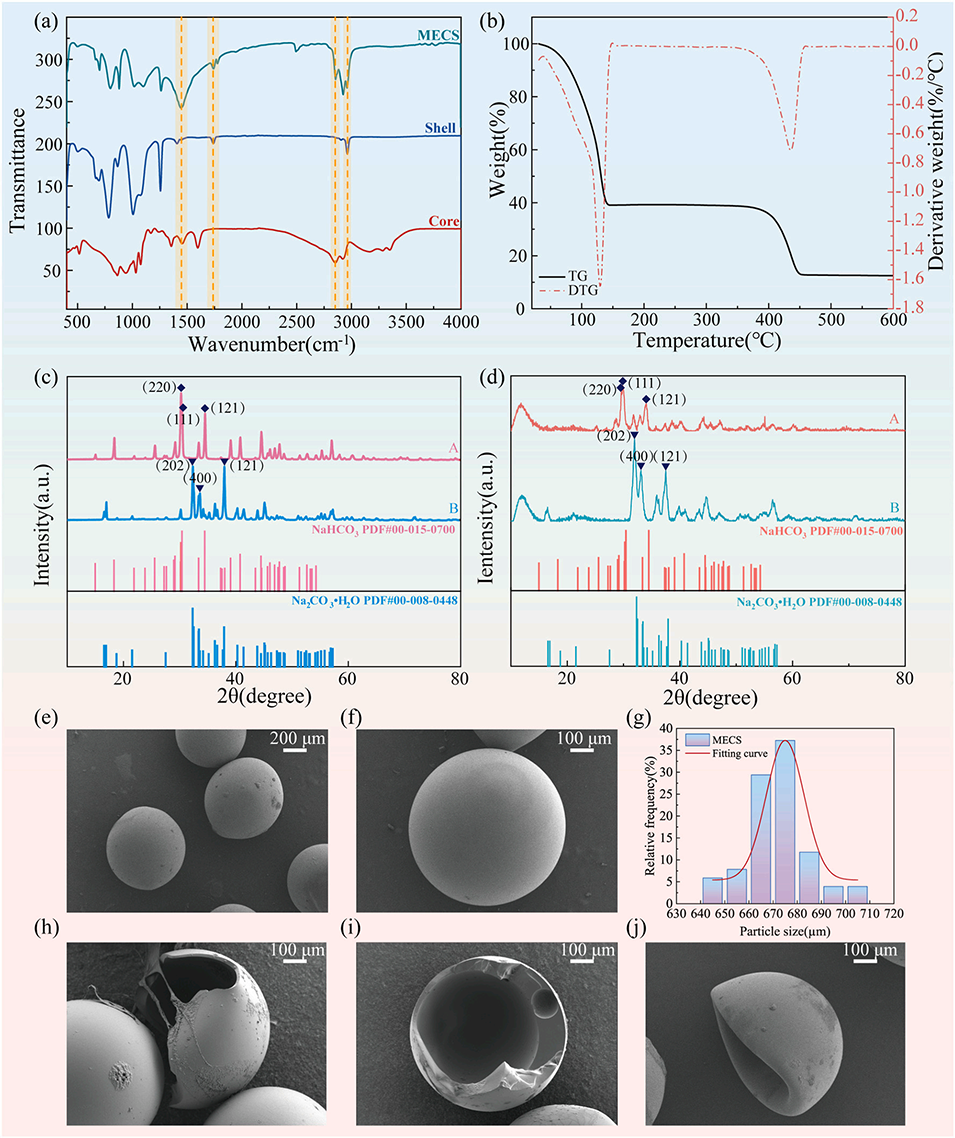 图4. MECS@Na₂CO₃-MEA的材料表征与形貌图。(a)MECS的傅里叶变换红外光谱(FT-IR)图;(b)MECS的热重(TG)曲线;(c)核心流体在CO₂吸收前后的X射线衍射(XRD)分析图;(d)MECS在CO2吸收前后的X射线衍射(XRD)分析图;(e)展示MECS完整形貌的扫描电子显微镜(SEM)图;(f)单个完整MECS的SEM图;(g)MECS的粒径分布图;(h)MECS的截面SEM图;(i)MECS内部空腔的SEM图;(j)壳层发生褶皱的MECS的SEM图。