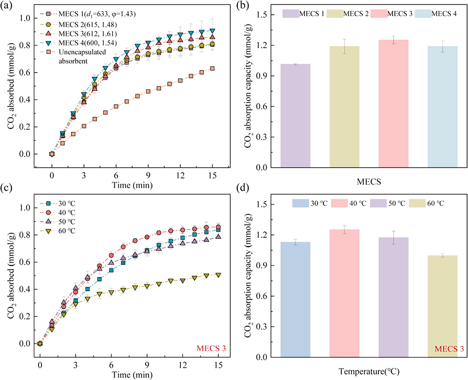 图5. MECS@Na₂CO₃-MEA与未封装吸收剂的CO₂吸收性能对比图。(a)40℃下MECS与未封装吸收剂的CO₂吸收速率曲线;(b)40℃下不同粒径MECS的饱和CO₂吸收容量图;(c)不同温度下MECS 3的CO₂吸收速率曲线;(d)流速比为400:12:16的MECS 3在不同温度下的饱和CO₂吸收容量图。