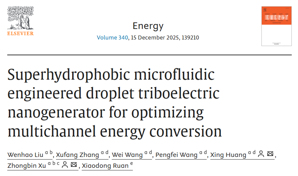 为此,浙江大学许忠斌教授、浙大城市学院黄兴副教授等人开发了一种超疏水微流控液滴摩擦纳米发电机,通过精准控制多通道液滴的尺寸与均匀性,使16通道设备的电能输出较单通道提升7倍以上,实现了显著的性能突破。该设计为在屋檐、河岸等场景下高效收集雨水等分散式液滴能量提供了一种稳定、高效的解决方案。相关研究以“Superhydrophobic Microfluidic Engineered Droplet Triboelectric Nanogenerator for Optimizing Multichannel Energy Conversion”为题目,发表在期刊《Energy》上。