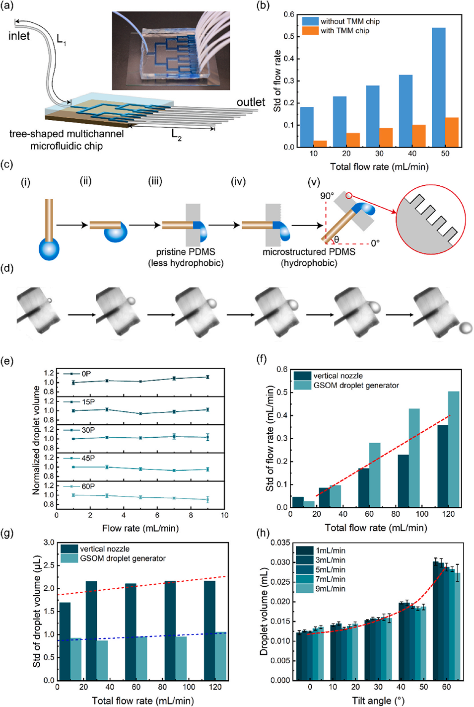 2、通过树状多通道微流控芯片和重力驱动超疏水开放式微流控液滴发生器,实现了空气中均匀液滴的并行生成。