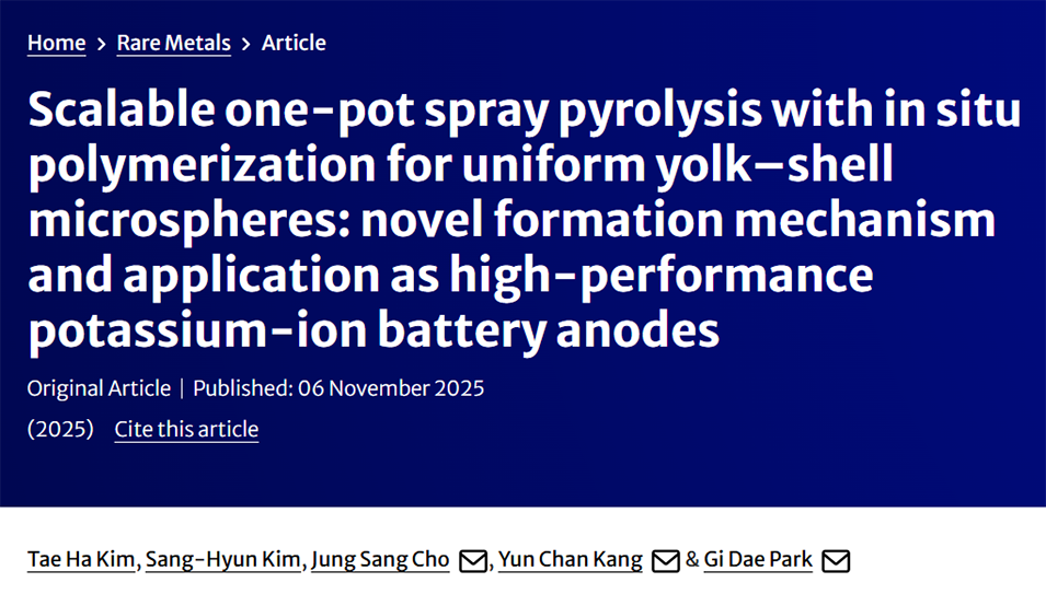 近期,有研究人员提出一种结合原位聚合与干燥控制剂(如DMF)的新型一锅法喷雾热解策略,通过系统调控柠檬酸、乙二醇等碳源,成功合成尺寸均一的yolk-shell微球,并提出基于金属-金属氧化物-碳中间体的新型形成机制,还将其衍生的硫化镍@碳微球应用于钾离子电池负极,展现出优异的电化学性能。相关研究以“Scalable one-pot spray pyrolysis with in situ polymerization for uniform yolk–shell microspheres: novel formation mechanism and application as high-performance potassium-ion battery anodes”为题发表于期刊《Rare Metals》。