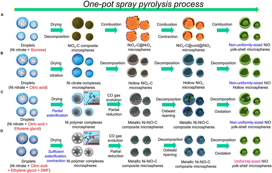 Scheme 1:以硝酸镍溶液为原料,采用不同碳源(A 为蔗糖、B 为 CA、C 为 CA/EG、D 为 CA/EG/DMF)通过一锅法喷雾热解制备yolk-shell微球的形成机制示意图