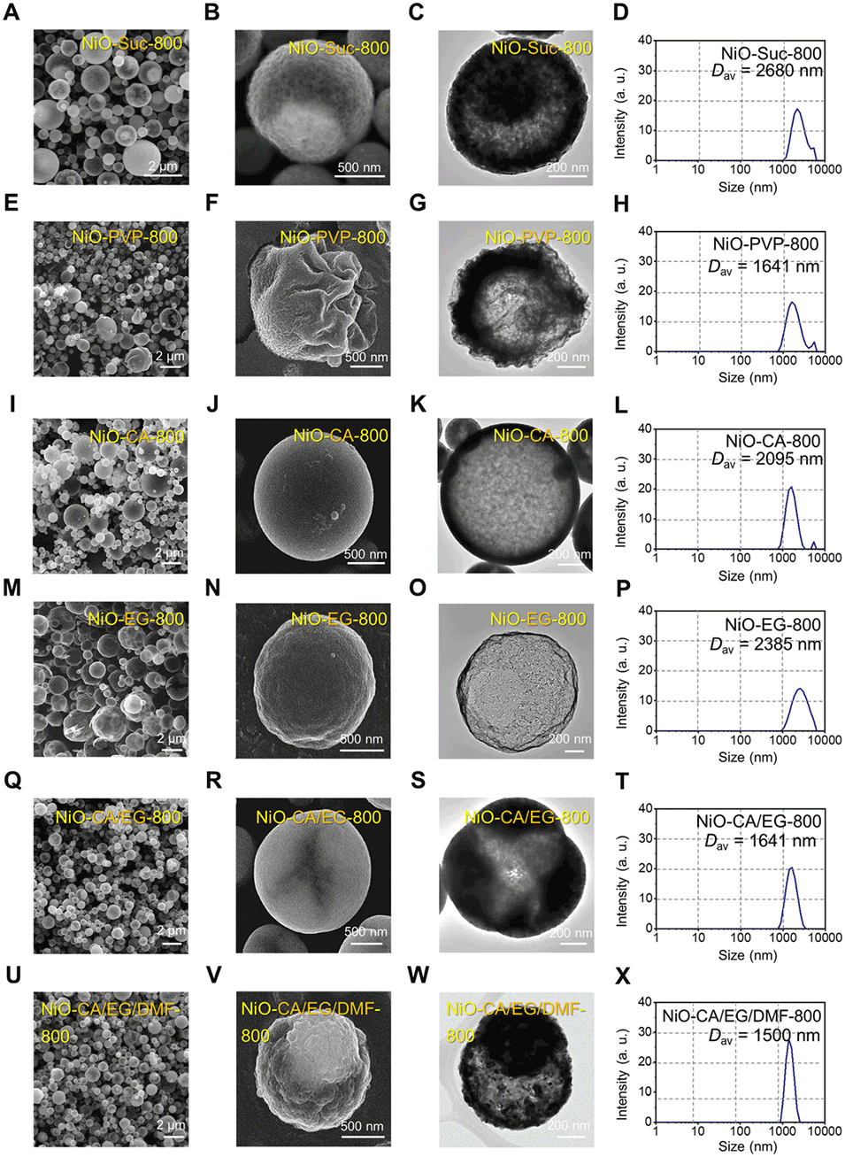 图1:NiO-Suc-800(A-D)、NiO-PVP-800(E-H)、NiO-CA-800(I-L)、NiO-EG-800(M-P)、NiO-CA/EG-800(Q-T)及 NiO-CA/EG/DMF-800(U-X)的扫描电子显微镜(SEM)图像、透射电子显微镜(TEM)图像及动态光散射(DLS)数据