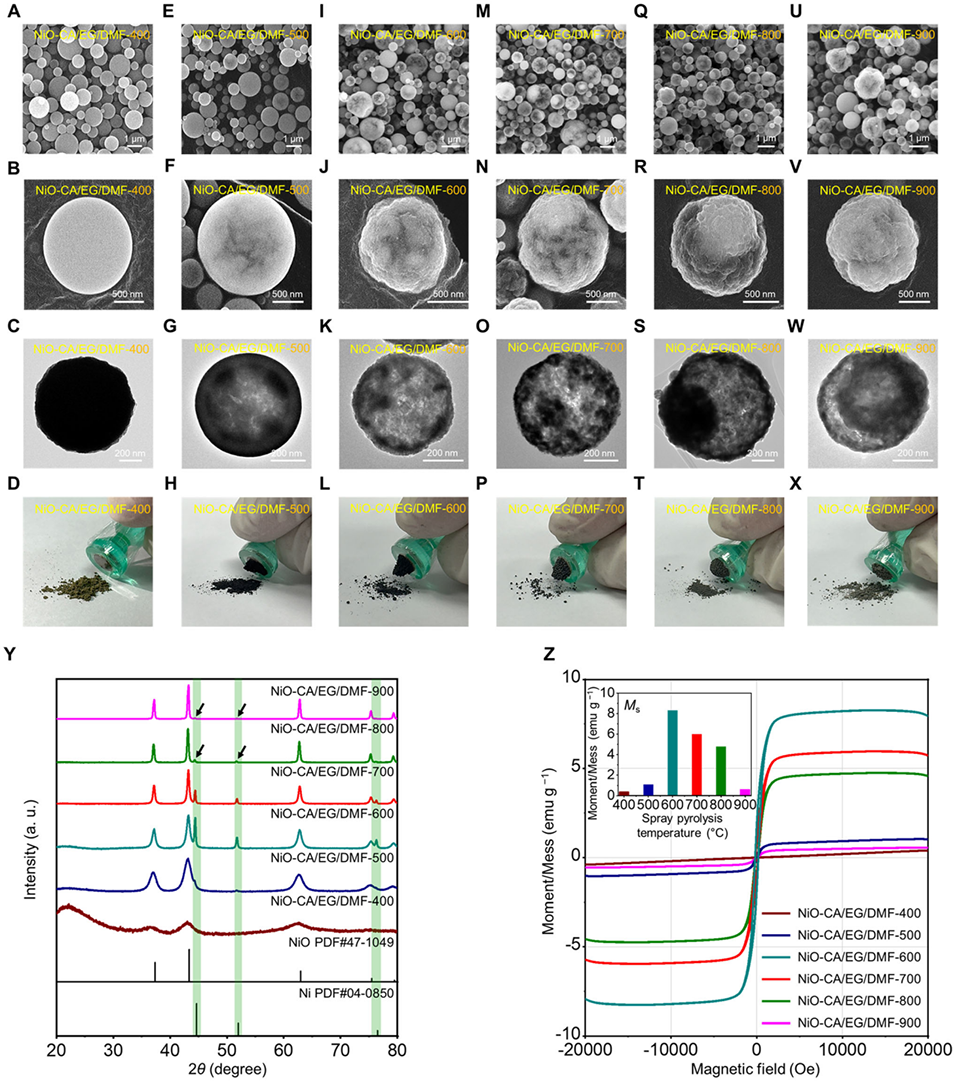 图2:NiO-CA/EG/DMF-400(A-C)、NiO-CA/EG/DMF-500(E-G)、NiO-CA/EG/DMF-600(I-K)、NiO-CA/EG/DMF-700(M-O)、NiO-CA/EG/DMF-800(Q-S)及 NiO-CA/EG/DMF-900(U-W)的 SEM 图像与 TEM 图像;D、H、L、P、T、X 为不同喷雾热解温度下合成的 NiO-CA/EG/DMF 的磁性测试图像;Y 为不同喷雾热解温度下合成的 NiO-CA/EG/DMF 的 X 射线衍射(XRD)图谱;Z 为不同喷雾热解温度下合成的 NiO-CA/EG/DMF 的振动样品磁强计(VSM)数据