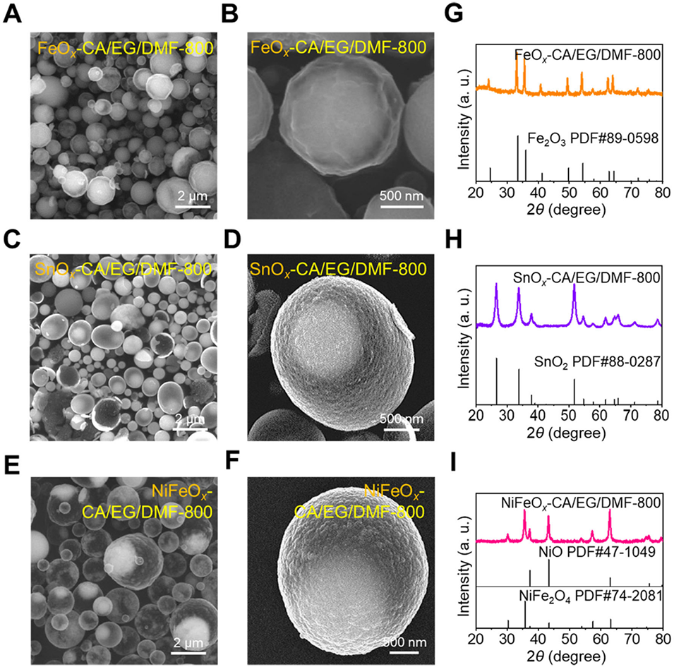 图3:多种金属氧化物yolk-shell微球的形貌与晶体结构:FeOₓ-CA/EG/DMF-800(A、B)、SnOₓ-CA/EG/DMF-800(C、D)及 NiFeOₓ-CA/EG/DMF-800(E、F)的 SEM 图像;G 为 FeOₓ-CA/EG/DMF-800 的 XRD 图谱;H 为 SnOₓ-CA/EG/DMF-800 的 XRD 图谱;I 为 NiFeOₓ-CA/EG/DMF-800 的 XRD 图谱