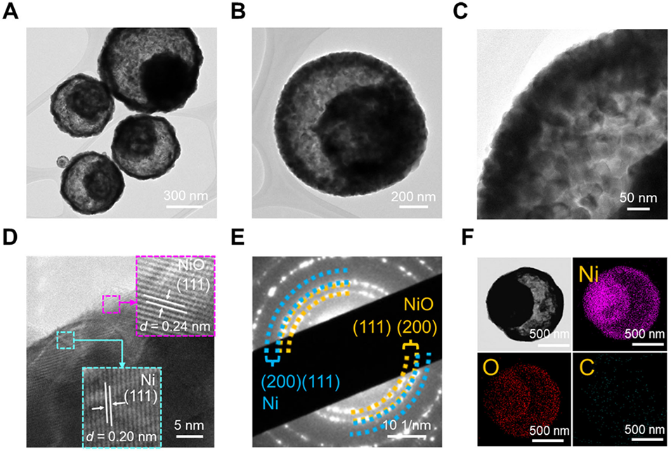 图4:NiO-CA/EG/DMF-800 的详细特征:A-C 为 TEM 图像;D 为高分辨率透射电子显微镜(HR-TEM)图像;E 为选区电子衍射(SAED)图谱;F 为 NiO-CA/EG/DMF-800 的元素映射 图像