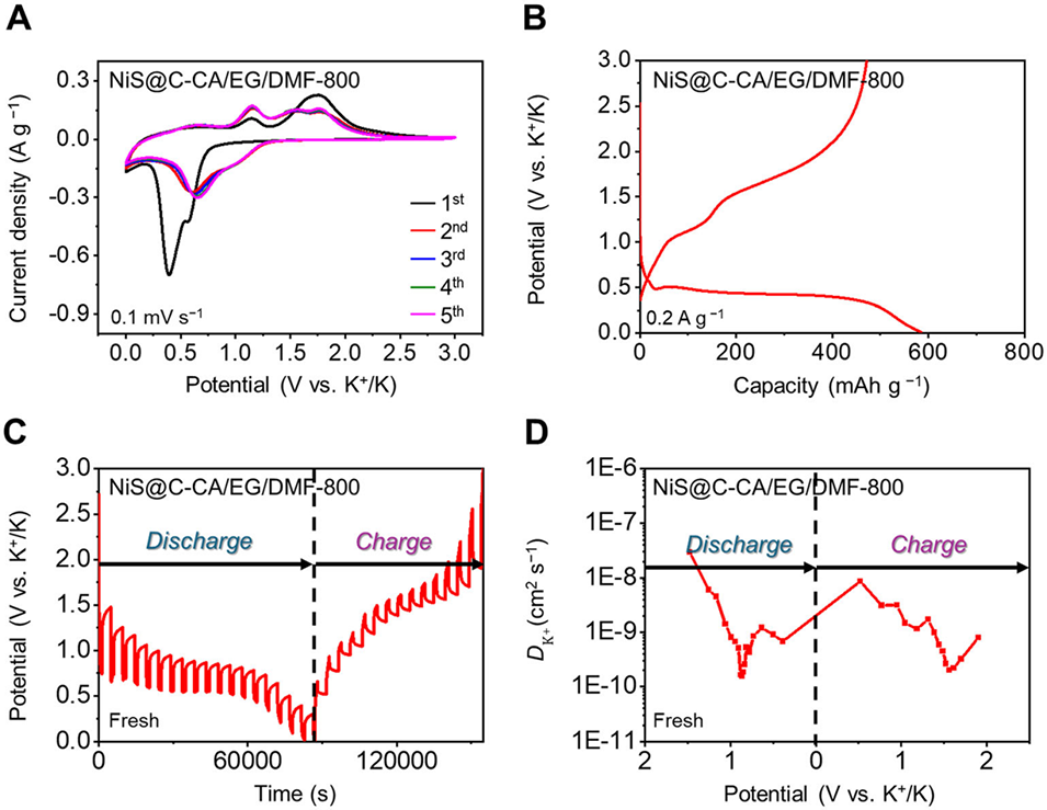 图6:NiS@C-CA/EG/DMF-800 的电化学性能:A 为循环伏安(CV)曲线;B 为其首次充放电曲线;C 为恒电流间歇滴定技术(GITT)电势曲线;D 为 NiS@C-CA/EG/DMF-800 对应的钾离子扩散系数