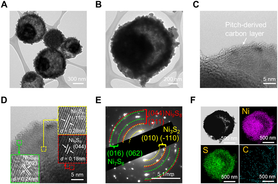 图5:NiS@C-CA/EG/DMF-800 的详细特征:A-C 为 TEM 图像;D 为 HR-TEM 图像;E 为 SAED 图谱;F 为 NiS@C-CA/EG/DMF-800 的元素映射图像