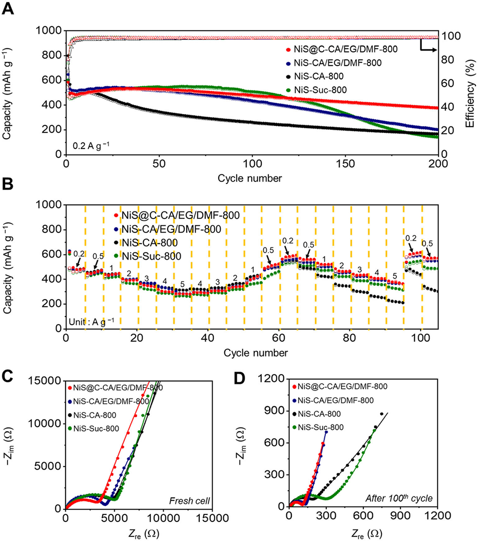 图7:NiS@C-CA/EG/DMF-800、NiS-CA/EG/DMF-800、NiS-CA-800 及 NiS-Suc-800 的电化学性能:A 为电流密度 0.2 A・g-1 下的循环性能;B 为倍率性能;C 为新鲜电池的奈奎斯特(Nyquist)图谱(实测点与拟合线);D 为循环 100 次后电池的 Nyquist 图谱(实测点与拟合线)
