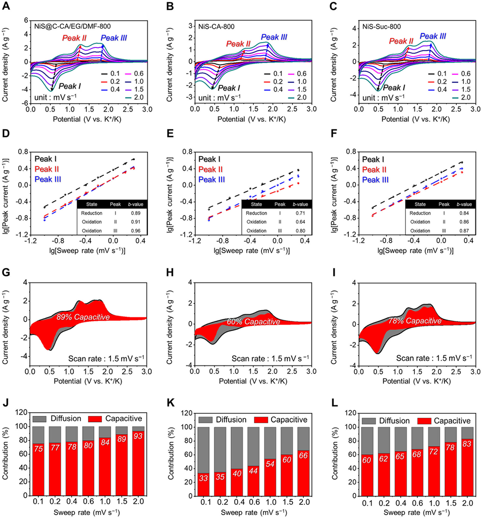 图8:钾离子存储动力学分析:A-C 为不同扫描速率下的 CV 曲线;D-F 为峰 I、峰 II、峰 III 的 lg(峰电流)-lg(扫描速率)拟合曲线;G-I 为扫描速率 1.5 mV・s-1 下电容贡献(红色区域)占总电流的 CV 曲线;J-L 为不同扫描速率下的容量贡献占比:A、D、G、J 对应 NiS@C-CA/EG/DMF-800;B、E、H、K 对应 NiS-CA-800;C、F、I、L 对应 NiS-Suc-800