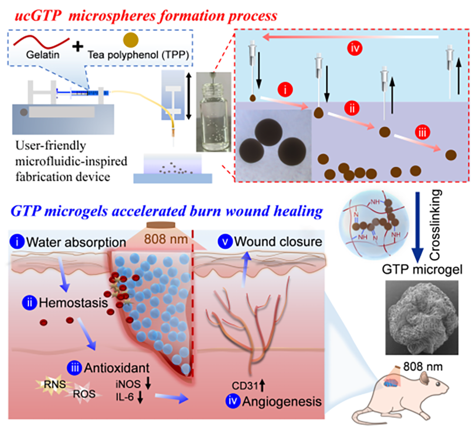 近期,扬州大学医学部陈建美博士团队提出一种受微流控启发的简易制备策略,成功开发出具有内在生物活性的明胶-茶多酚微凝胶(GTP microgels)。该材料集成了优异的止血性能、强大的抗氧化活性以及稳定的近红外光热效应,无需依赖任何外源药物添加,为烧伤创面治疗提供新方案。相关研究以“Microfluidics‐Inspired Microgels with Intrinsic Bioactivity for Advanced Burn Wound Therapy”为题目,发表于期刊《Advanced Healthcare Materials》。
