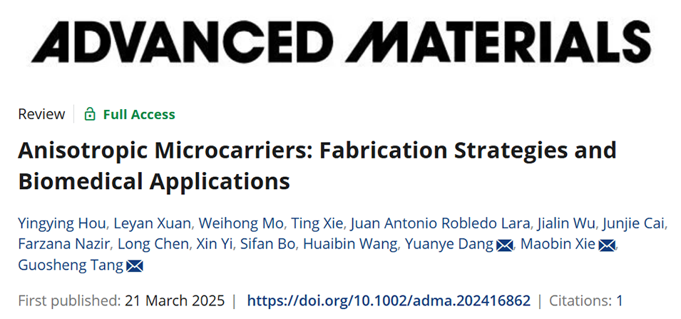 近期,广州医科大学唐国胜教授、谢茂彬教授与党元野副教授联合发表综述,系统梳理AMs近二十年的制备策略与生物医学应用进展。该研究深入分析了AMs的形貌、制造策略与应用之间的相互作用及依赖关系,针对性提出适用于不同形貌的制备方案与特定生物医学场景的选型指南。此外,就当前面临的挑战及未来发展方向进行了展望。相关研究成果以“Anisotropic Microcarriers: Fabrication Strategies and Biomedical Applications”为题目,发表于期刊《Advanced Materials》。