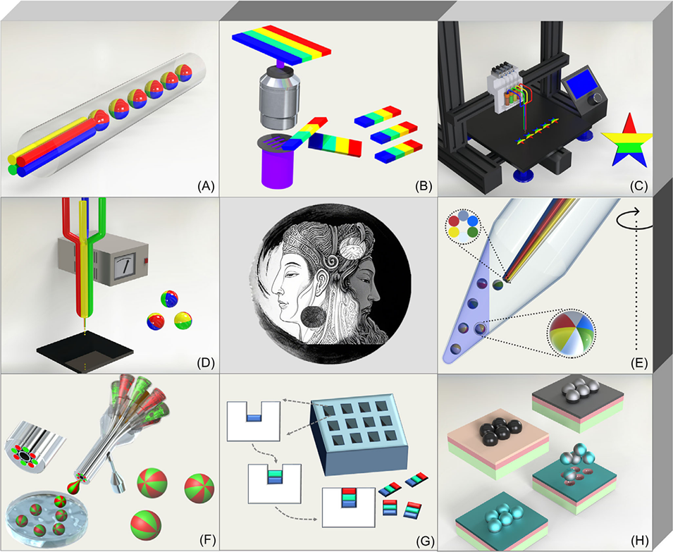 图1. 各向异性微载体的多种制备方法示意图,包括A)微流控法、B)光刻法、C)3D打印法、D)静电驱动共喷射法(EHD)、E)离心法、F)气流辅助剪切法、G)模板法、H)溅射镀膜法。